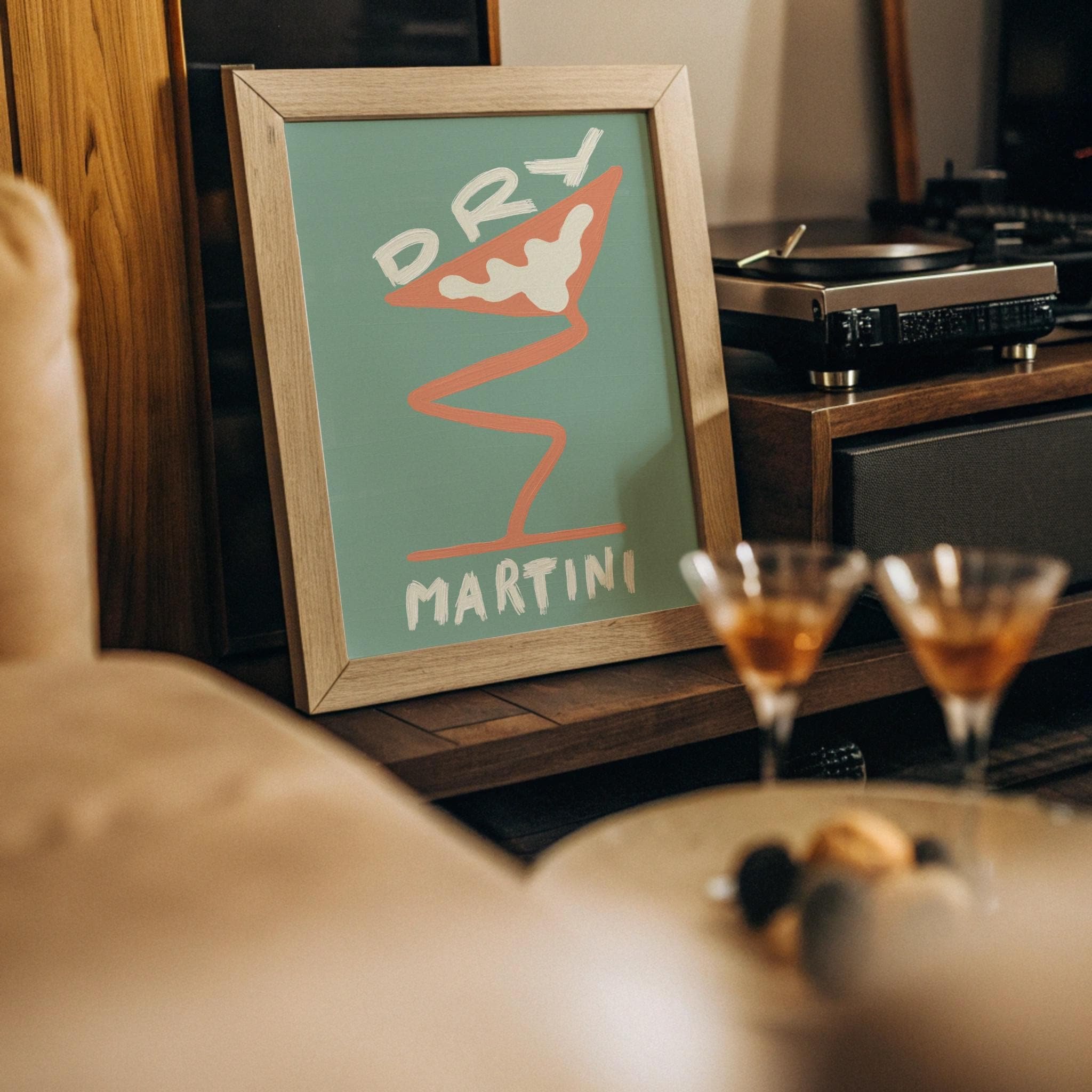 Cin Cin! Bring colors and a modern twist to your bar cart with this tipsy Dry Martini wall art print.