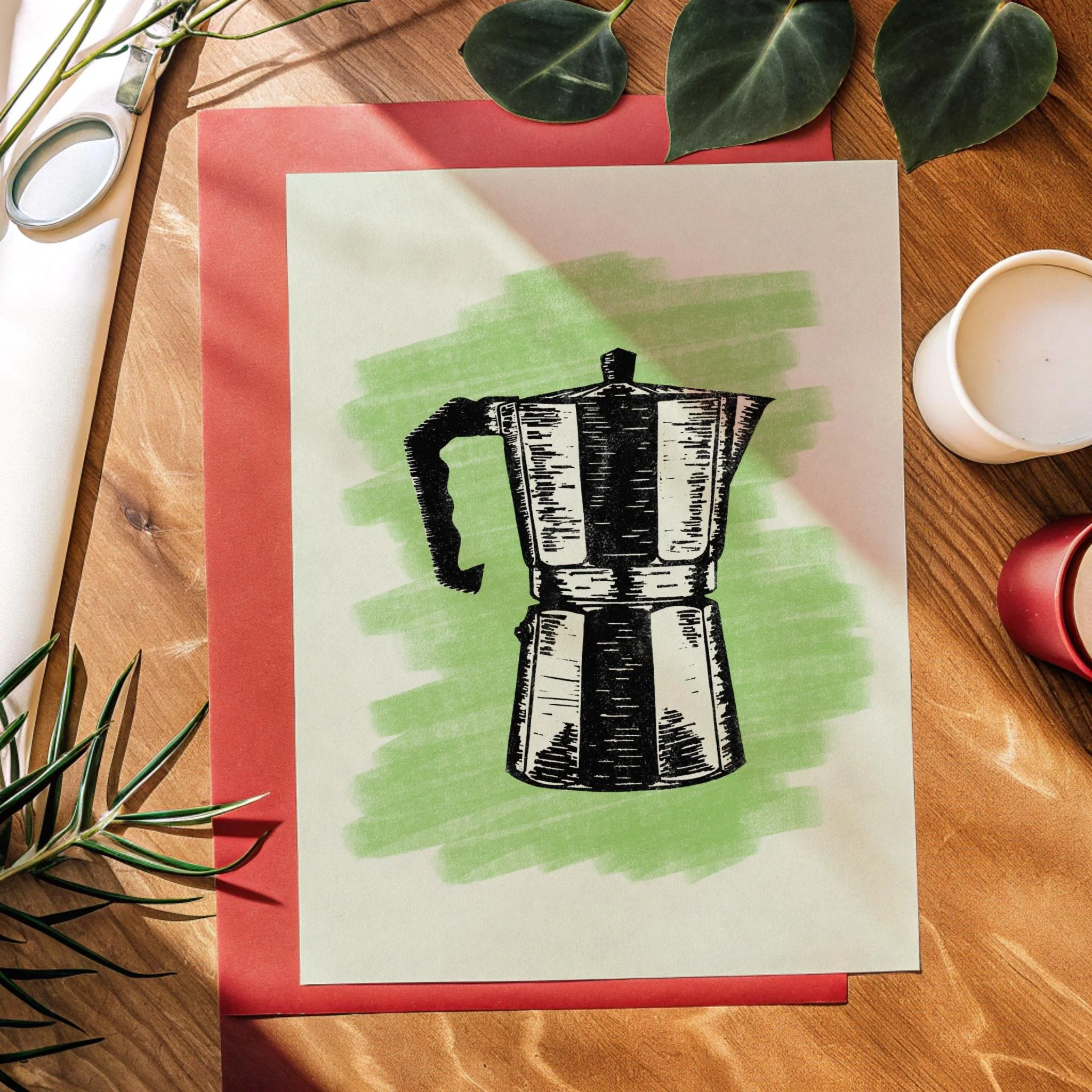 Stove coffee maker wall art premium print from a hand-made lino cut